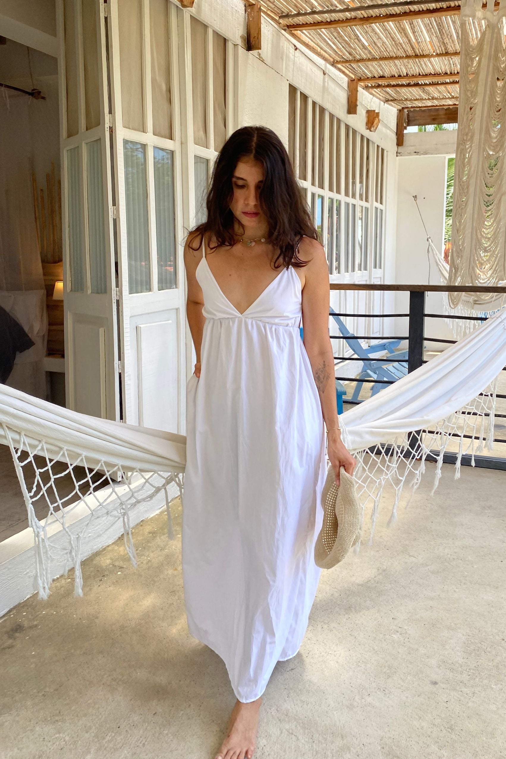 Fresco, versátil y con ese toque relajado que hace del verano una experiencia. Nuestro Maxidress Playa de tiras delgadas, escote en V y espalda descubierta está hecho para acompañarte desde un día relajado bajo el sol hasta una cena frente al mar.