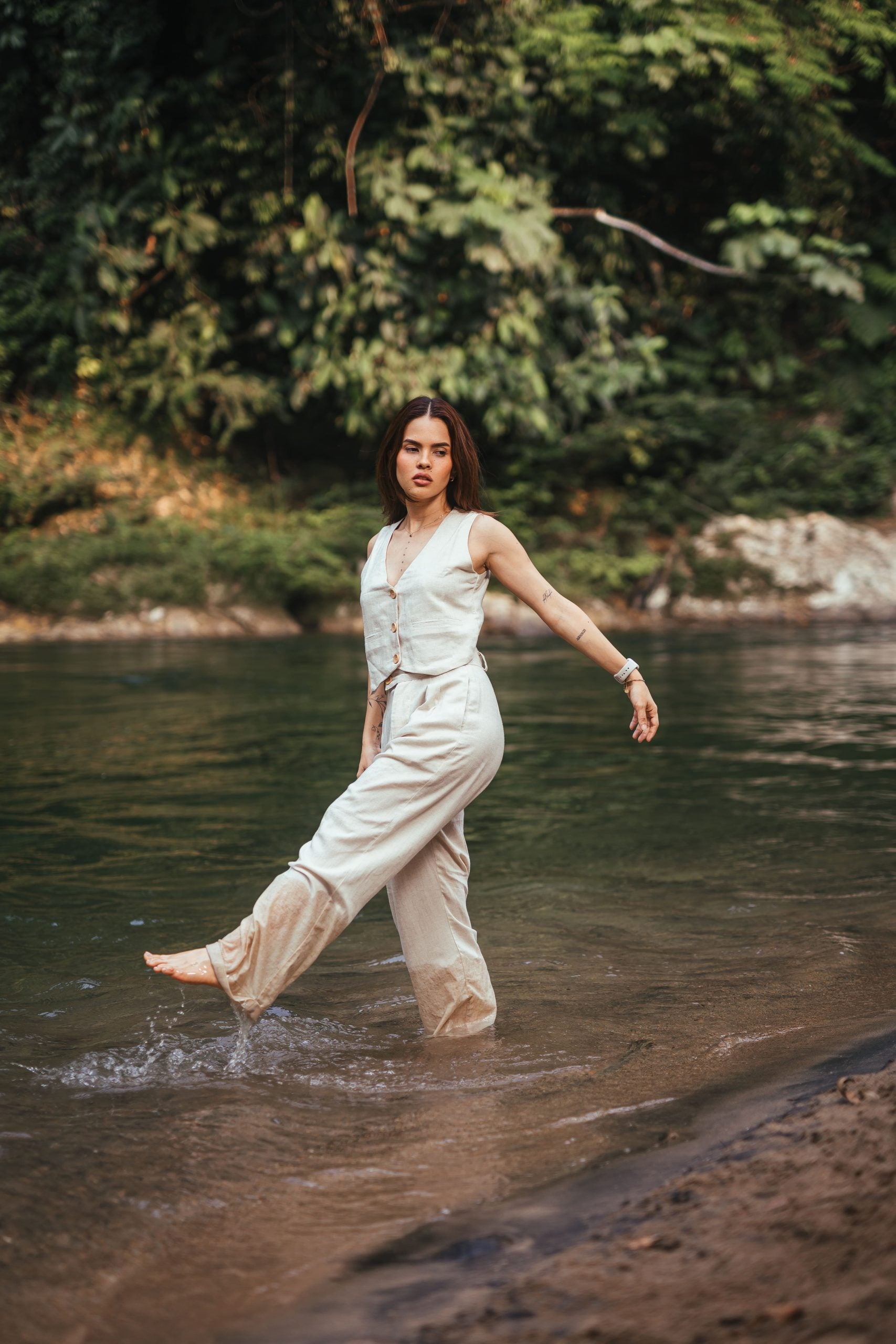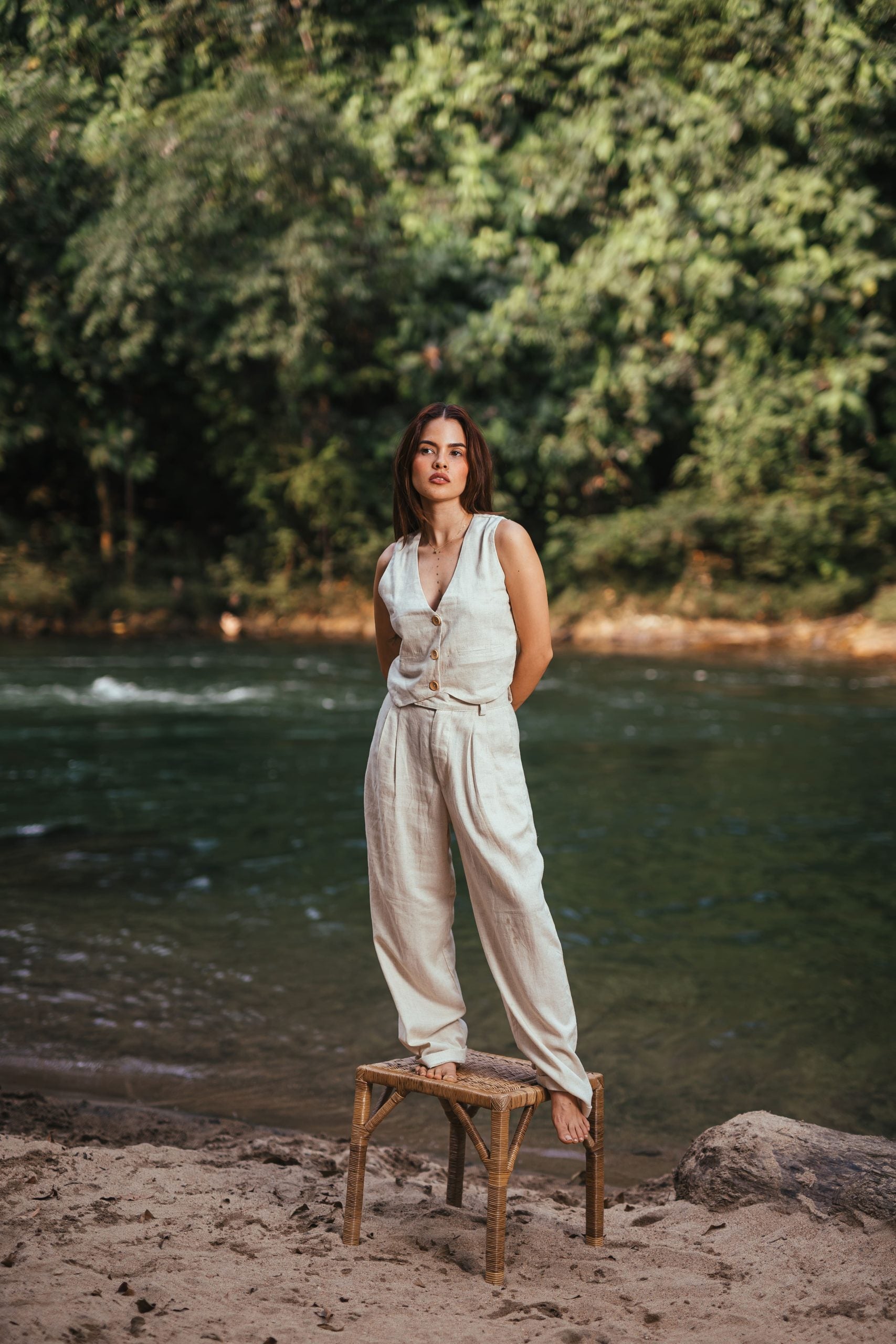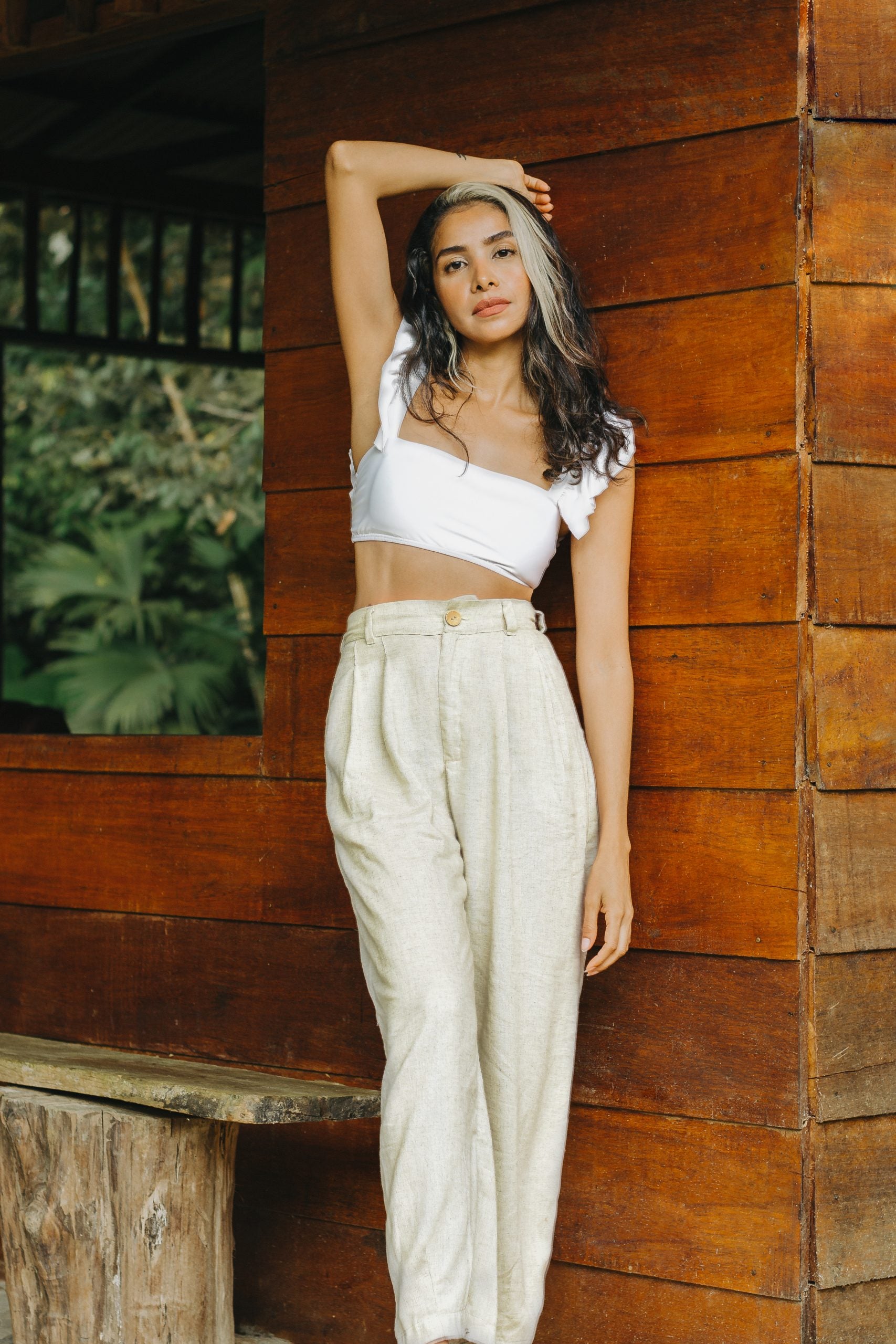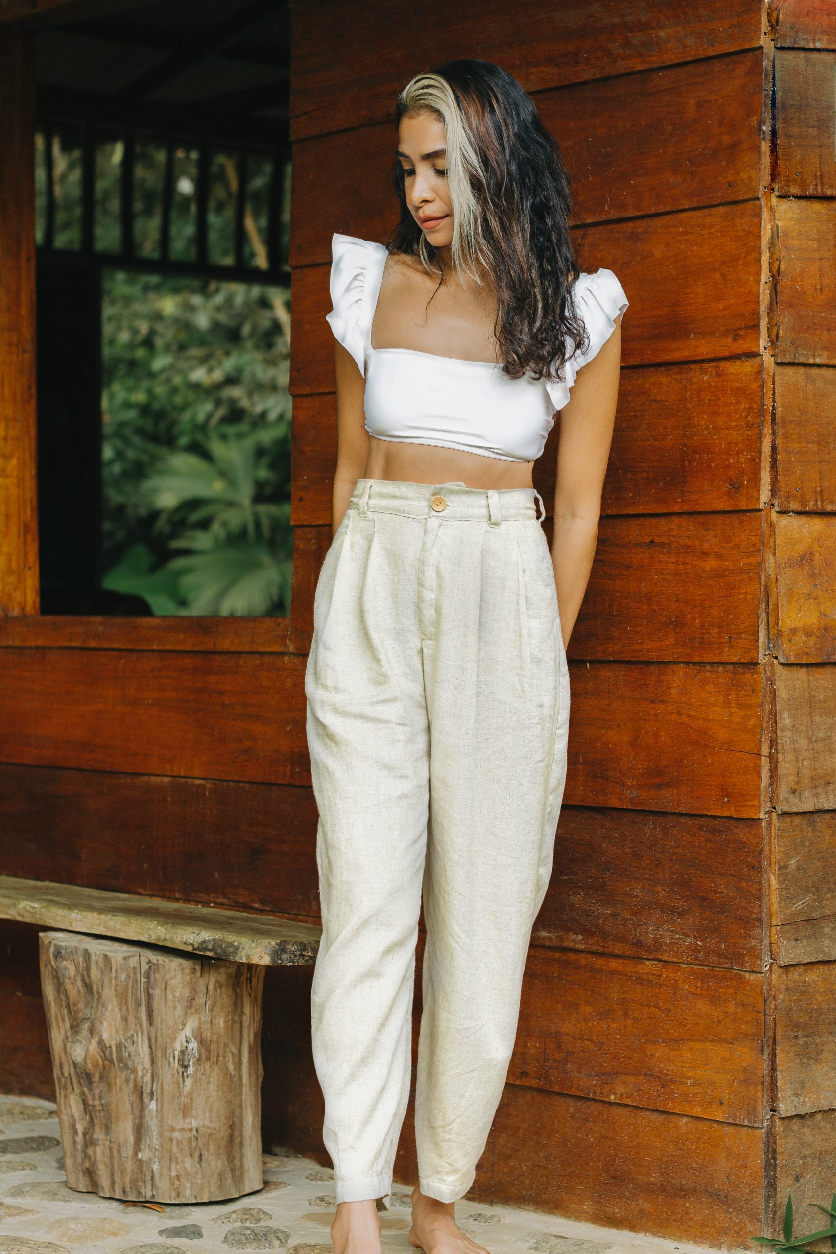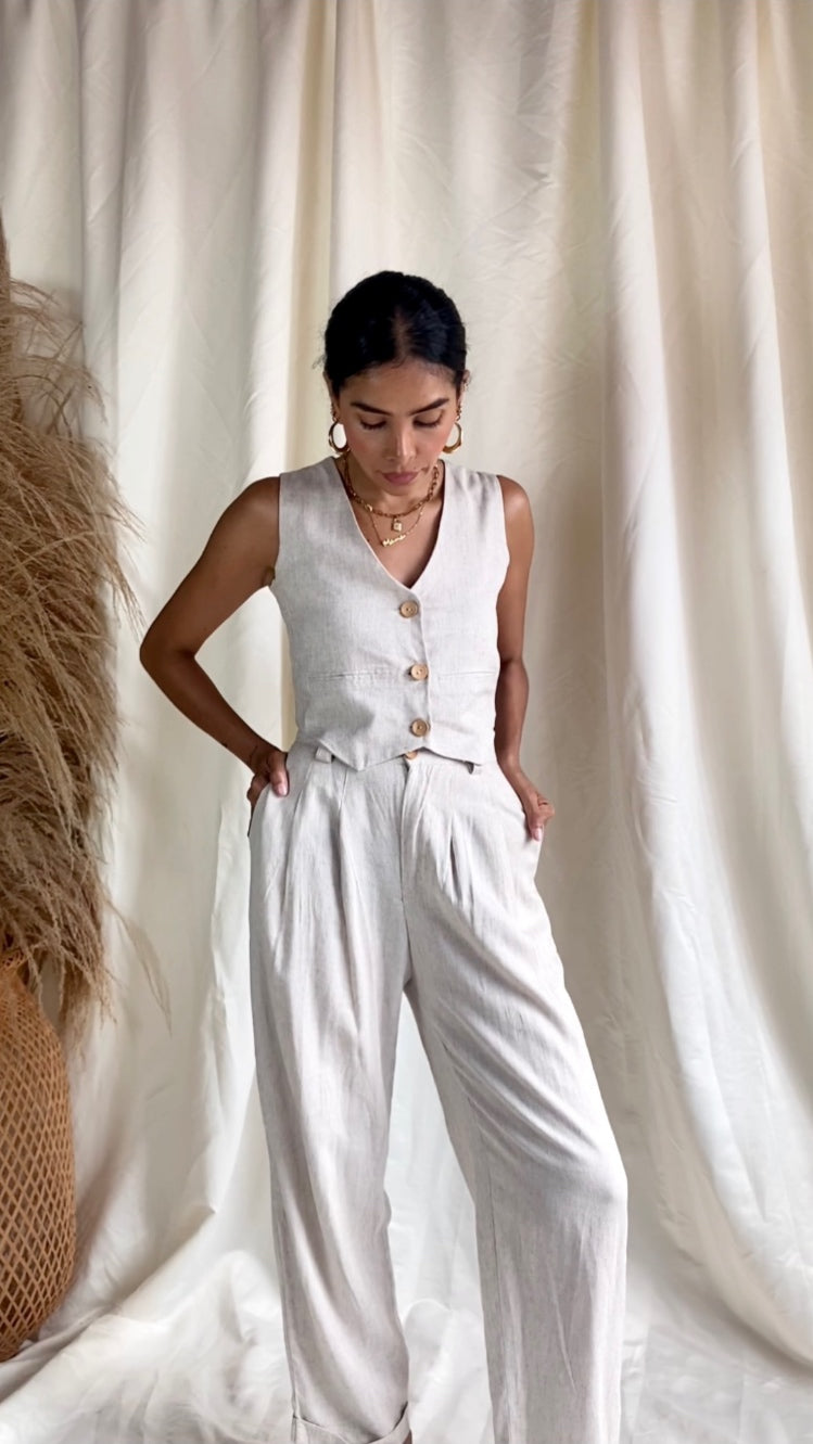 Elaborado en lino de alta calidad, este es un pantalón de corte clásico, con prenses y cierre. Con silueta tipo baggy y guardapolvo.
