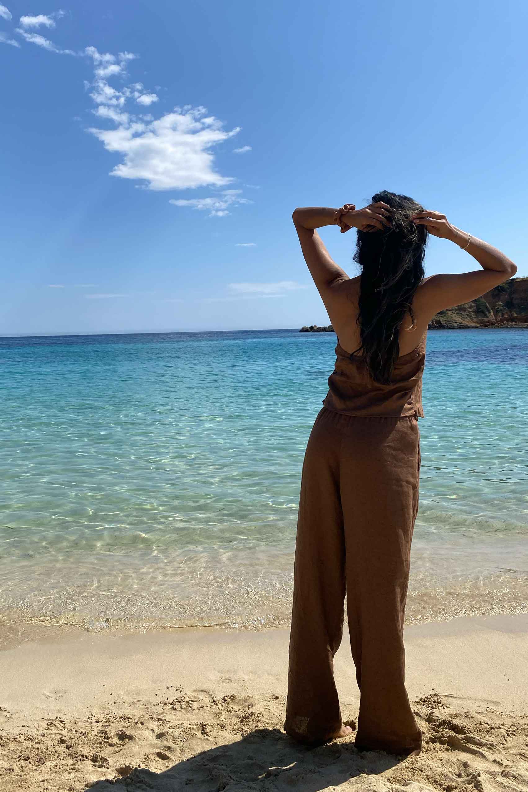Pantalón de silueta fluida, hecho en lino mocca de la mejor calidad y en un color atemporal. Su pretina encauchada y con cordón se adapta a diferentes medidas, funciona perfecto para dos tallas o más.