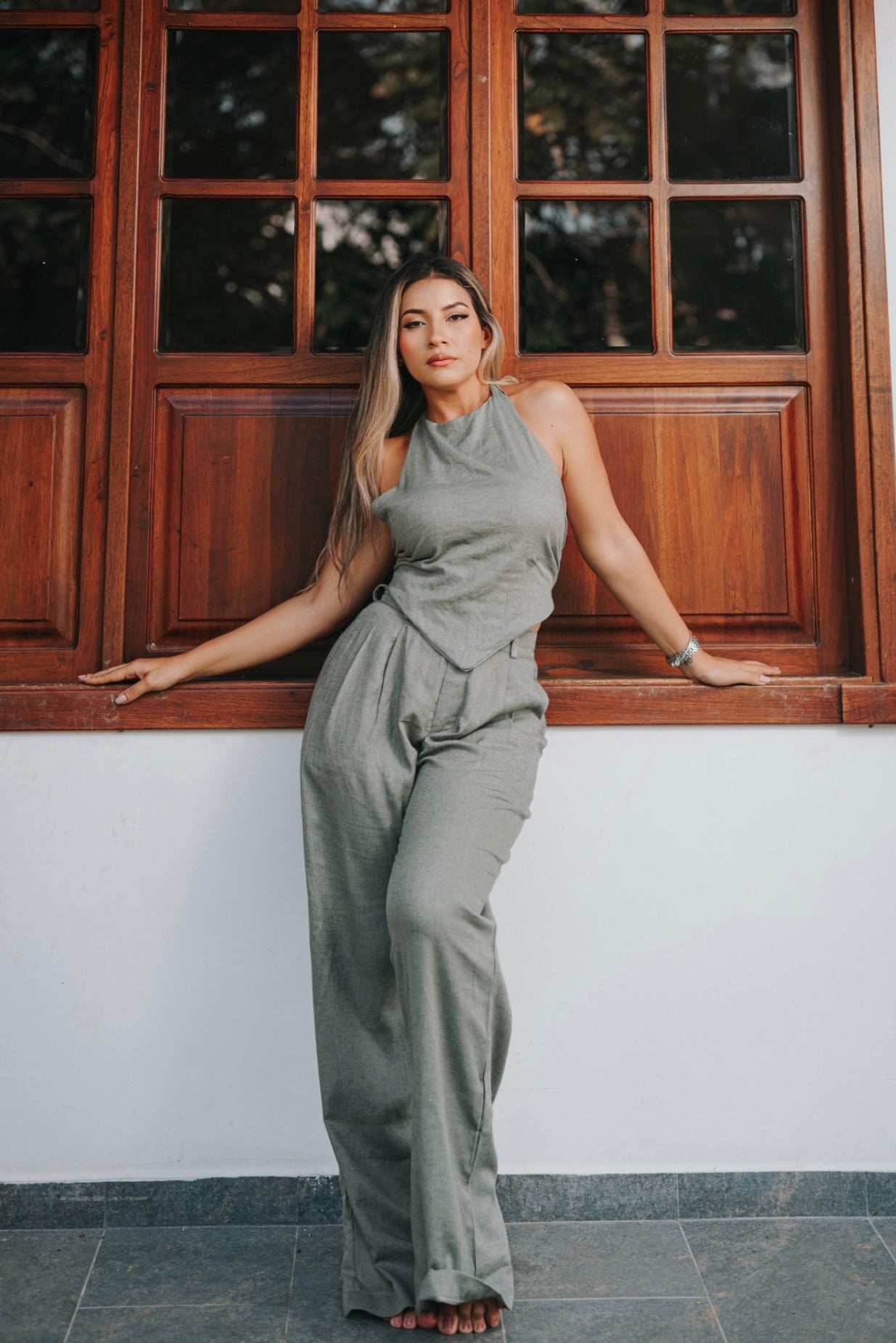 Elaborado en lino de alta calidad, este es un pantalón de corte clásico, con prenses y cierre. De silueta fluida y bota amplia .