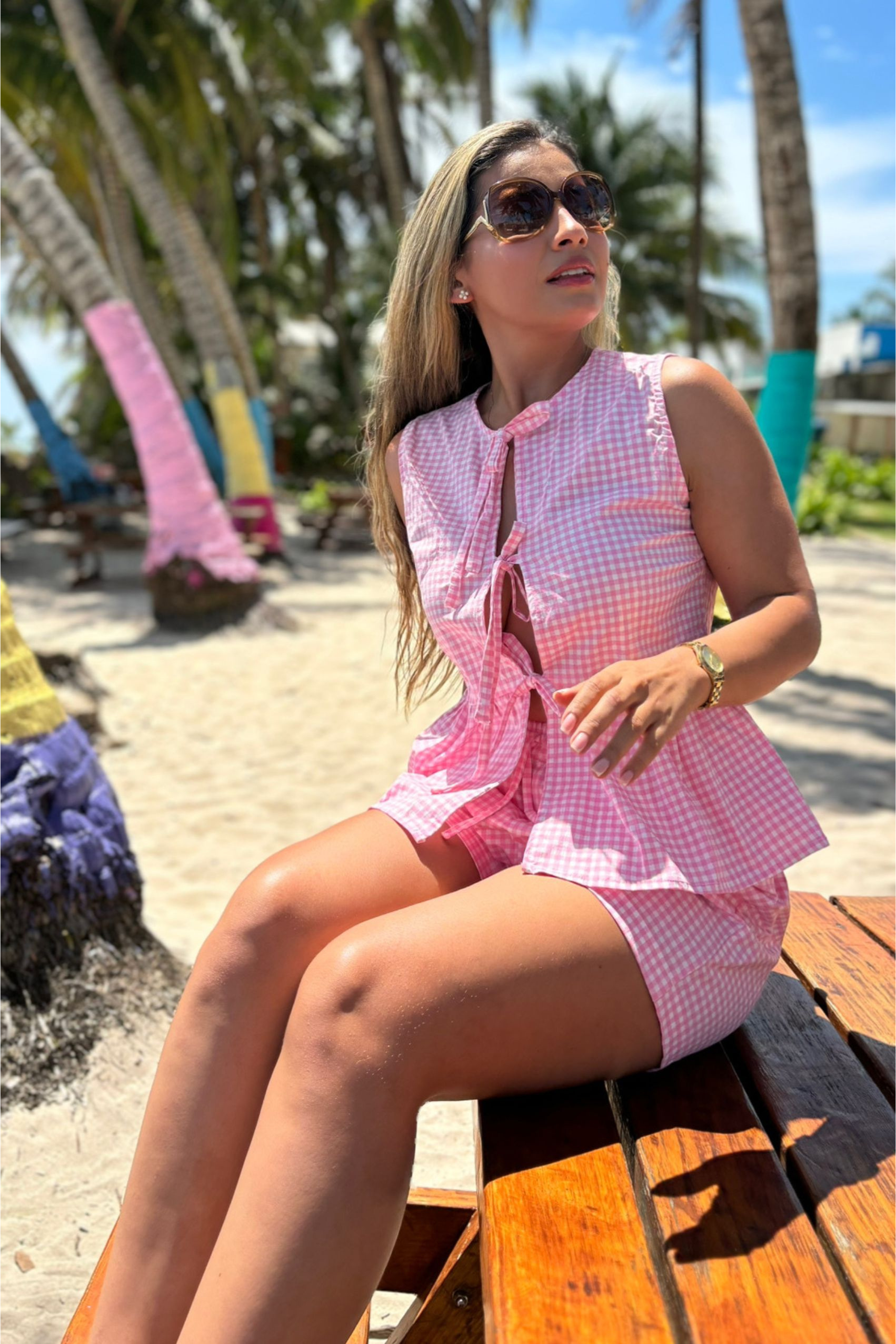 Top en algodón, con lazos al frente, de silueta romántica que por su color y cuadros vichy se comporta como una pieza statement en tu look.